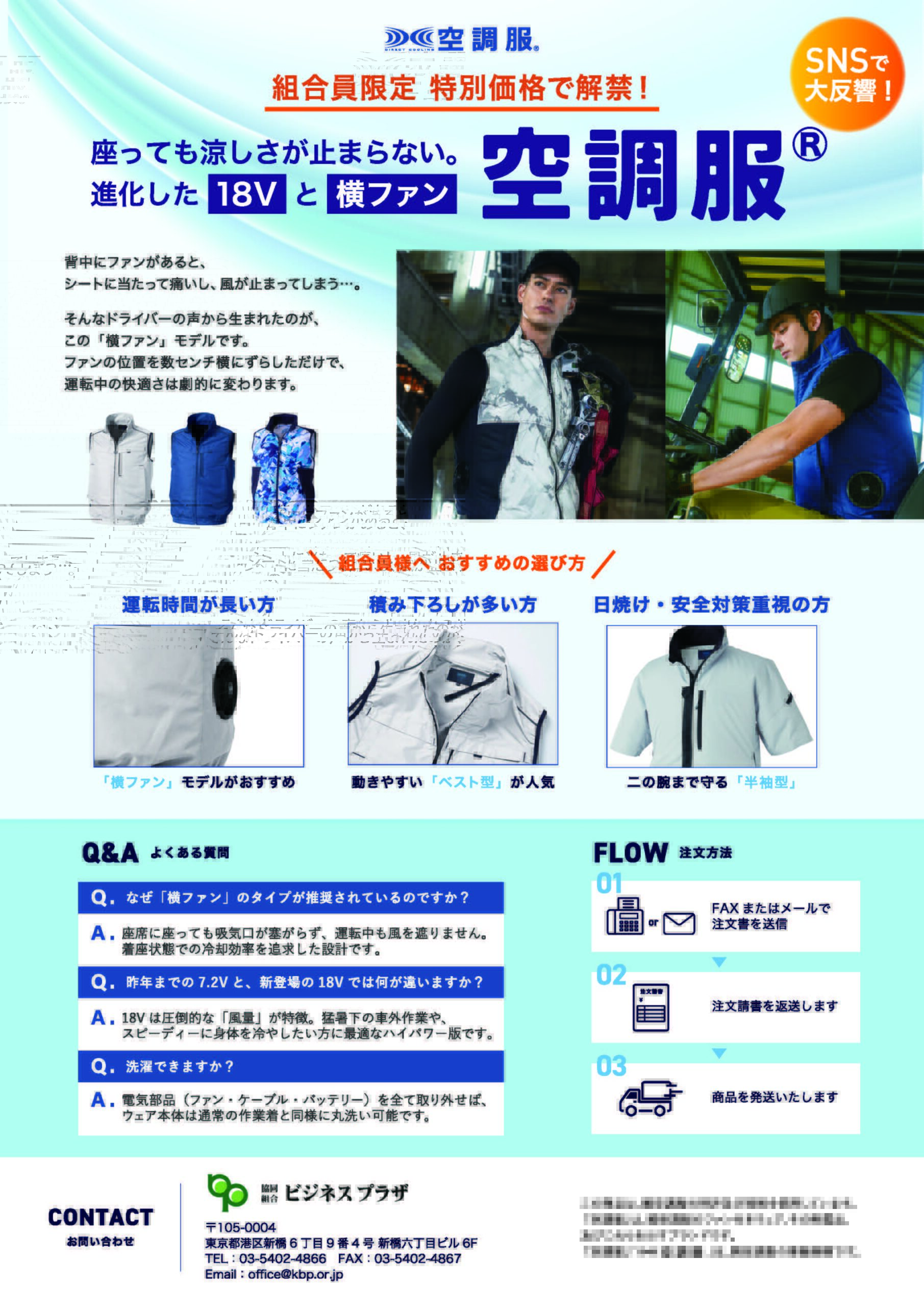 さて、これから本格的な夏を迎えるにあたり、組合員の皆様の熱中症対策および作業環境の改善を目的といたしまして、本年も「空調服(ファン付きウェア)」の特別販売を実施いたします。